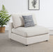 Create your own modular home setup with this plush, armless chair. It entices you to sink into its deep, comfortable cushions. The chair can function alone, as well as part of a larger sectional sofa. The simple lines of the piece add up to a comfy, easy-to-use element in any decor. Linen adds a natural textural accent.