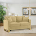 Indulge in opulent comfort with this textured velvet loveseat. Its reversible feather blend seat and back cushions, complemented by curved arms and gold stainless steel legs. Smooth upholstery and lustrous details blend simplicity with timeless splendor, making this piece a perfect focal point for refined interiors. With its inviting profile and graceful presence, it elevates both style and relaxation. Key Features: • Loveseat with plush seating designed to elevate both comfort and style • Textured velvet finish in a warm camel hue • Reversible feather blend cushions ensure adaptable support • Curved arms and gold-accented stainless steel legs add subtle luxury • Fully encased engineered wood frame with sinuous springs and pocket coils • Reversible seat and reversible back cushions for easy maintenance