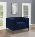 A sumptuous transitional accent chair will be a vibrant addition to your home. You'll love the stunning navy blue matte velvet fabric upholstery for its softness and visual appeal. The bench-style seat with pocket coil springs will offer the perfect comfort and support for your needs. Deep vertical channels highlight the shelter back and inside arms. Tapered black metal legs put the finishing touches on this vibrant chair that will become a family favorite.