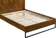 Create a distinctly contemporary vibe in your bedroom sanctuary with this Reed queen-sized bed from the Reed Wood collection. This handsome bed offers a touch of traditional flair with its antique coffee finish and chevron inlaid wood design. It rests on a metal base in sleek black matte for a modern touch. The hardware-free design lends authenticity to the chic, sophisticated and minimalist design of this bed, which features an extra-tall headboard for a dramatic finish.