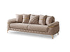The specially designed metal base, highlighted by its eye-catching gold color, enhances the overall elegance. Gold accents on the arm details further emphasize its sophistication. The stitched fabric structure on the armrests not only provides an aesthetic look but also ensures durability; these details contribute to the refined character of the sofa set.
